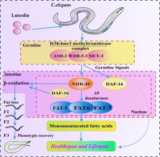 通过药物干预来有针对性地调控脂质稳态,是应对肥胖症并延长各种生物体寿命的有效策略。从可食用植物中提取的木犀草素具有广泛的药理活性。本研究发现由木犀草素诱导的低脂表型能够传递给子代。同时,该研究发现DAF-16/FOXO、NHR-49/PPAR-α以及β-氧化基因和Δ9多聚不饱和脂肪酶等基因对于跨代脂肪调节至关重要。此外,H3K4me3标记脂肪代谢基因并增强其转录,在多代低脂遗传中发挥着作用。重要的是,本研究表明木犀草素激活核受体NHR-49/PPAR-α,进而上调Δ9多聚不饱和脂肪酶的转录,从而增加单不饱和脂肪酸的含量,这对于延长健康寿命是必需的。此外,通过筛选经典途径发现木犀草素还通过DAF-16促进健康寿命的延长。该研究揭示了木犀草素通过相同的机制减少脂肪并延长寿命,表明木犀草素是一种潜在的减肥和抗衰老分子。