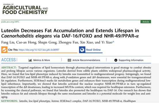 近日,我院刘芳副教授、2022级研究生洪曹安、2022级基础医学本科生龚诗琴、2022级基础医学本科生范忠玉为第一作者,肖毅副研究员为通讯作者,以遵义医科大学为第一单位,在食品科学领域国际知名期刊《Journal of Agricultural and Food Chemistry》(IF五年: 6.4;Q1;中科院一区top期刊)上在线发表了题为“Luteolin Decreases Fat Accumulation and Extends Lifespan in Caenorhabditis elegansvia DAF-16/FOXO and NHR-49/PPAR‑α”的研究性论文。指导老师为肖毅副研究员和刘芳副教授。该研究获得贵州省科技计划重点项目(QKHJC-ZK[2024]ZD071)、市校联合重点项目(2024[305])的支持。论文链接:https://doi.org/10.1021/acs.jafc.5c08997。