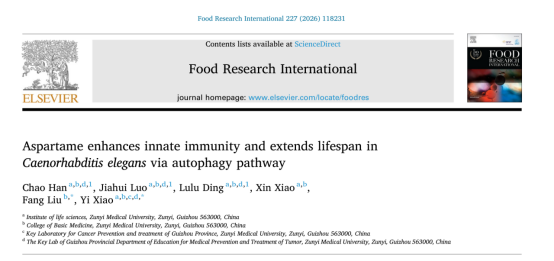 近日,我院2023级病原生物学研究生韩超、2025级生物化学与分子生物学研究生罗佳慧、2025级病原生物学研究生丁路路为第一作者,肖欣老师也参与本项研究,刘芳副教授和肖毅副研究员为通讯作者,以遵义医科大学为第一单位,在食品科学领域国际知名期刊《FoodResearch International》(IF五年: 8.5;Q1;中科院一区top期刊)上在线发表了题为“Aspartame enhances innate immunity and extends lifespan in Caenorhabditis elegans via autophagy pathway”的研究性论文。指导老师为肖毅副研究员和刘芳副教授。该研究获得贵州省科技计划重点项目(QKHJC-ZK[2024]ZD071)、市校联合重点项目(2024[305])的支持。论文链接:https://doi.org/10.1016/j.foodres.2025.118231。