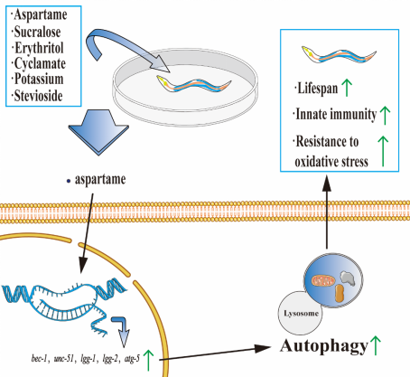阿斯巴甜(aspartame)是一种常用于食品和饮料中的人工甜味剂。目前,关于阿斯巴甜安全性的争议十分激烈。然而,阿斯巴甜对先天免疫和寿命的分子机制还不清楚。在这项研究中,通过筛选六种不同的人工甜味剂(阿斯巴甜、三氯蔗糖、赤藓糖醇、糖精、安赛蜜和甜菊糖苷),发现只有阿斯巴甜(1、10和100μM)以剂量依赖的方式增强了对铜绿假单胞菌的抵抗力。阿斯巴甜通过降低线虫肠道中的细菌负荷,从而增强对病原体的抵抗力,而不是通过影响病原体的增殖或毒性。转录组测序和GO功能富集分析显示自噬功能集显著的富集。RT-qPCR实验证实,阿斯巴甜处理上调了关键自噬基因bec-1、unc-51、lgg-1、lgg-2 和atg-5 的mRNA水平。此外,阿斯巴甜诱导了自噬标志物lgg-1::gfp 的增加。鉴于自噬在调节各种压力方面所起的作用,本研究发现阿斯巴甜也通过自噬途径延长秀丽隐杆线虫的寿命和增强其抗氧化能力。此外,阿斯巴甜改善了衰老线虫的健康状况,包括衰老色素的积累和运动能力。这项研究揭示,阿斯巴甜可以通过激活进化上保守的自噬途径来增强秀丽隐杆线虫的先天免疫、延长健康寿命,并提高抗氧化能力。这些发现为全面理解阿斯巴甜的生物学效应提供了新的视角,并揭示了其潜在的有益价值。