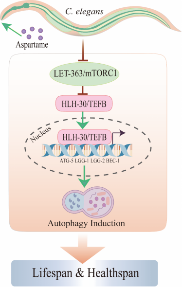 高糖饮食与多种健康风险相关,例如肥胖、代谢紊乱和心血管疾病。为了减轻高糖摄入对生物健康产生的不良影响,阿斯巴甜(Aspartame)被广泛用作一种糖替代品。在本研究中,以秀丽隐杆线虫为模型,揭示阿斯巴甜影响健康寿命的具体机制。研究结果表明,阿斯巴甜(1、10、100微摩尔/升)显著延长了秀丽隐杆线虫的寿命,并以剂量依赖的方式改善了健康指标,包括减少了脂褐素的积累和增强了运动能力,但并未影响线虫的繁殖能力。此外,通过筛选经典信号通路,发现阿斯巴甜通过雷帕霉素复合物1(mTORC1)途径延长了健康寿命。此外,阿斯巴甜能抑制mTORC1的活性,从而促进螺旋-环-螺旋蛋白30(HLH-30)(与哺乳动物TFEB同源)向细胞核的转移,随后上调自噬相关的基因,如atg-5、BECLIN 1(bec-1)、LC3、GABARAP、GATE-16家族成员1(lgg-1)和LC3、GABARAP、GATE-16家族成员2(lgg-2)。这最终激活了自噬过程,从而延缓了衰老。这一发现阐明了阿斯巴甜通过依赖mTORC1/TFEB途径诱导自噬,以增强秀丽隐杆线虫的健康寿命,为抗衰老研究提供了一种新的方法。