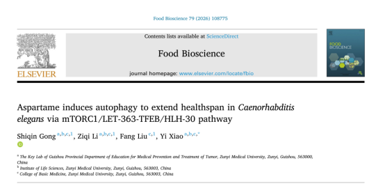 近日,我院2022级基础医学本科生龚诗琴、2025级医学美容专业本科生李梓齐、刘芳副教授为第一作者,肖毅副研究员为通讯作者,以遵义医科大学为第一单位,在食品科学领域国际知名期刊《FoodBioscience》(IF五年: 6.1;Q1;中科院一区top期刊)上在线发表了题为“Aspartame induces autophagy to extend healthspan inCaenorhabditis elegans via mTORC1/LET-363-TFEB/HLH-30 pathway”的研究性论文。指导老师为肖毅副研究员和刘芳副教授。该研究获得贵州省科技计划重点项目(QKHJC-ZK[2024]ZD071)、市校联合重点项目(2024[305])的支持。论文链接:https://doi.org/10.1016/j.fbio.2026.108775